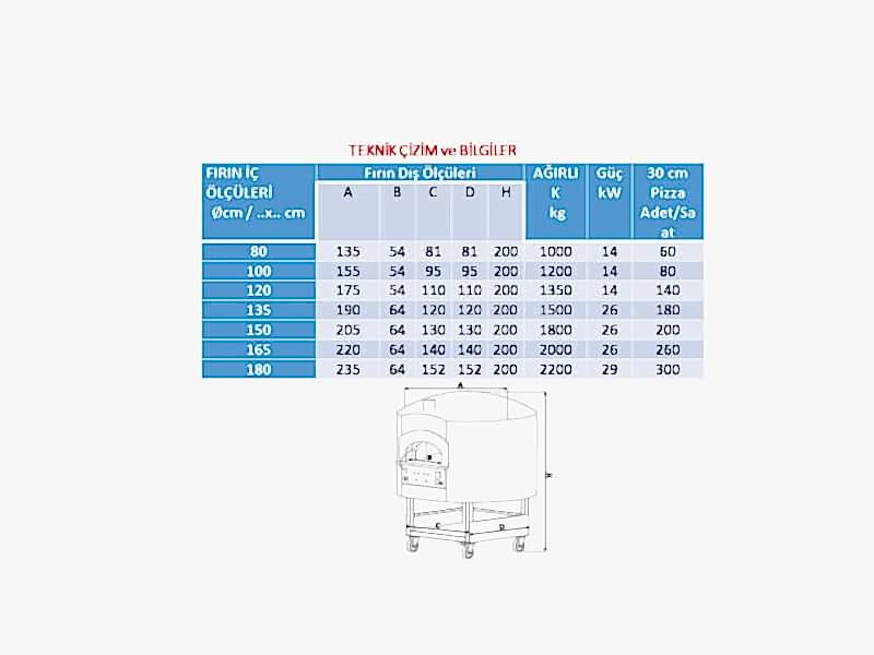 | FIRIN İÇ ÖLÇÜLERİ ∅cm / ..x.. cm | Fırın Dış Ölçüleri | AĞIRLIK kg | Güç kW | 30 cm Pizza Adet/Saat |